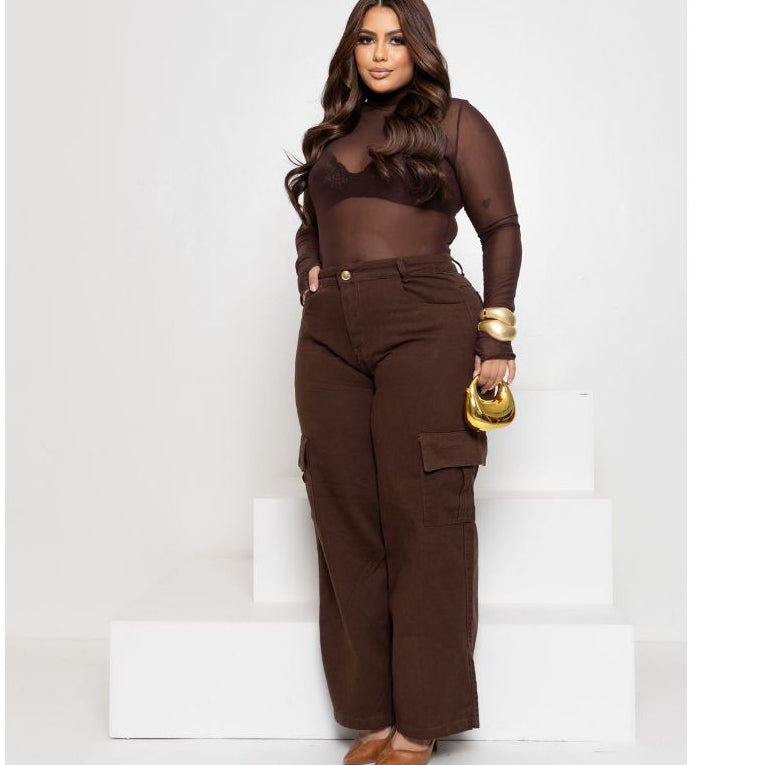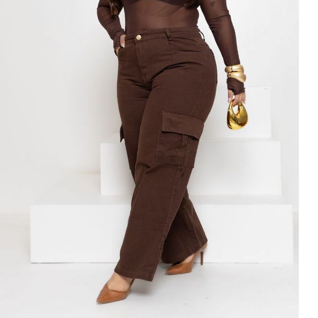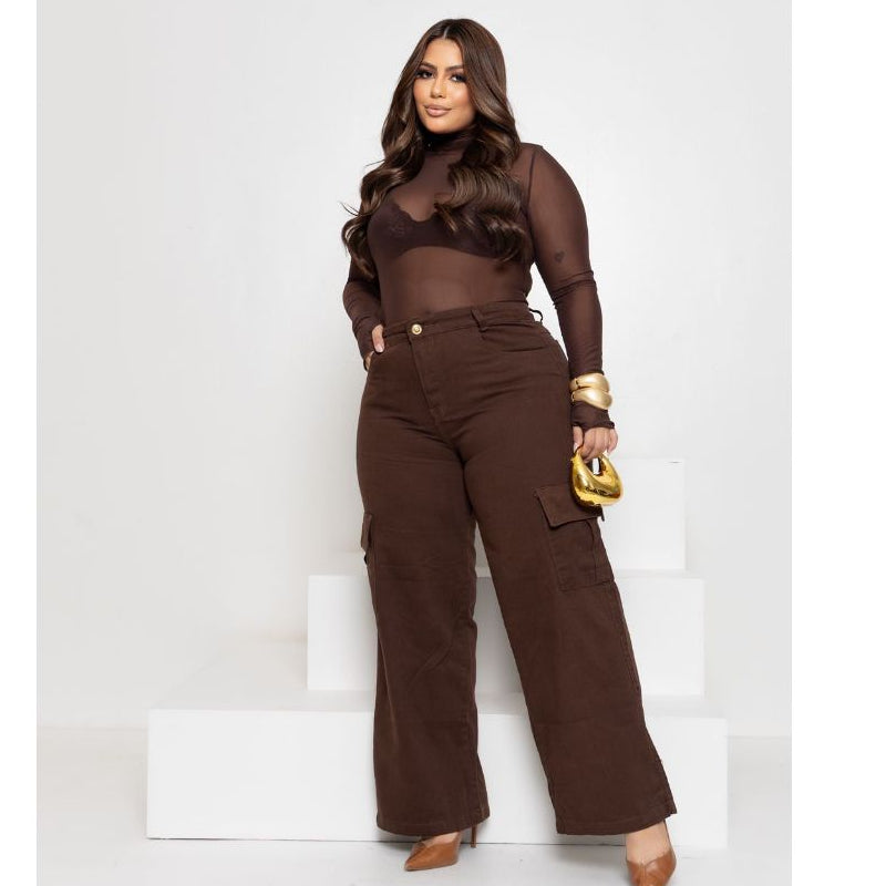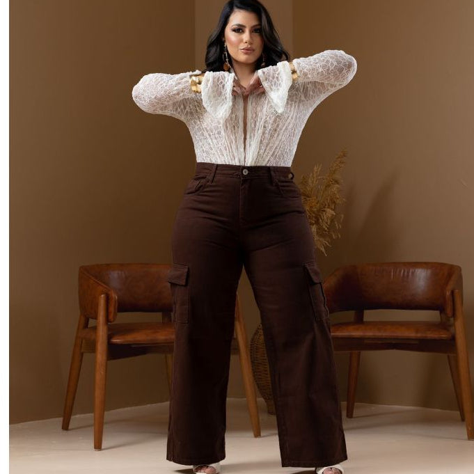 Calça Jeans Wide Leg Cargo Feminina Plus Size Marrom em Algodão Premium